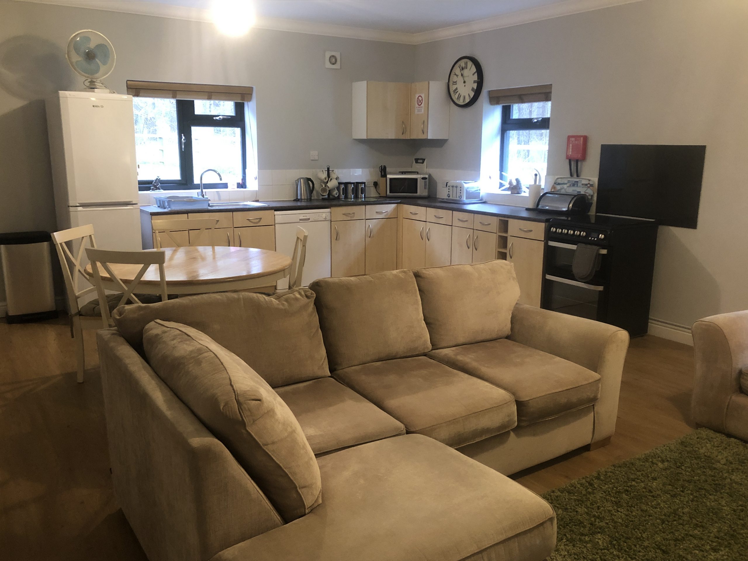 The open plan kitchen, dining and lounge area is spacious and well equipped.